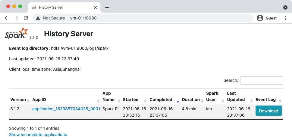通过 http://vm-01:18081 可以进入 Spark History Server 页面: