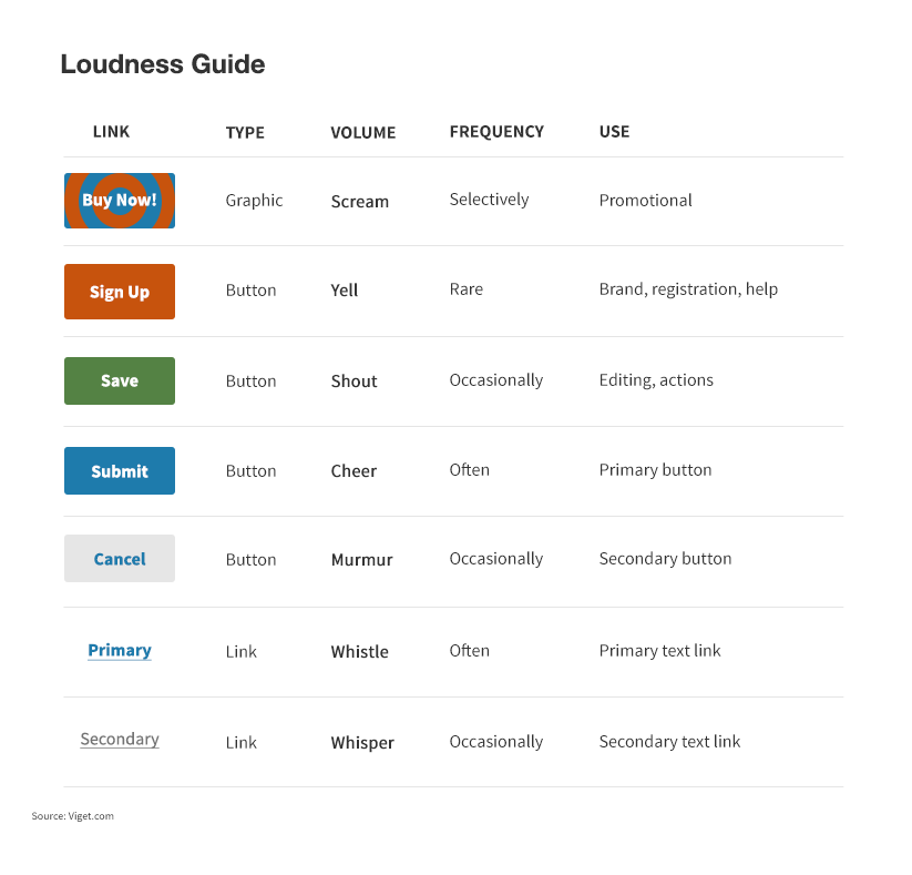 其实就好像我们说话可以通过音量大小来控制信息的可感知程度,希望接受者听清楚的就说大声一点。汤姆奥斯本(Tom Osborne)的视觉响度指南(Visual Loudness Guide)是一个如何系统地处理按钮和链接的例子,它们不是单独列出,而是作为一个套件呈现,并且根据每个元素的视觉冲击力会相应的拥有一个「响度」值。我们在构建设计语言系统时,也同样需要设置梯级「响度」的按钮、字重等组件来满足不同场景的表达需求。