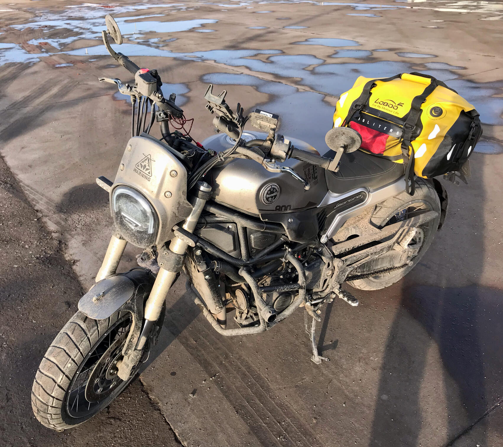 前半程的国道一路都是风景,但从张北到乌兰察布的后半程除了大车和尘土啥都没有。天彻底放晴,一股暖意上来,还好老天没太折磨我,停下来特意给我脏了吧唧但不离不弃的小摩托照了张像,纪念有史以来最脏的一次。
