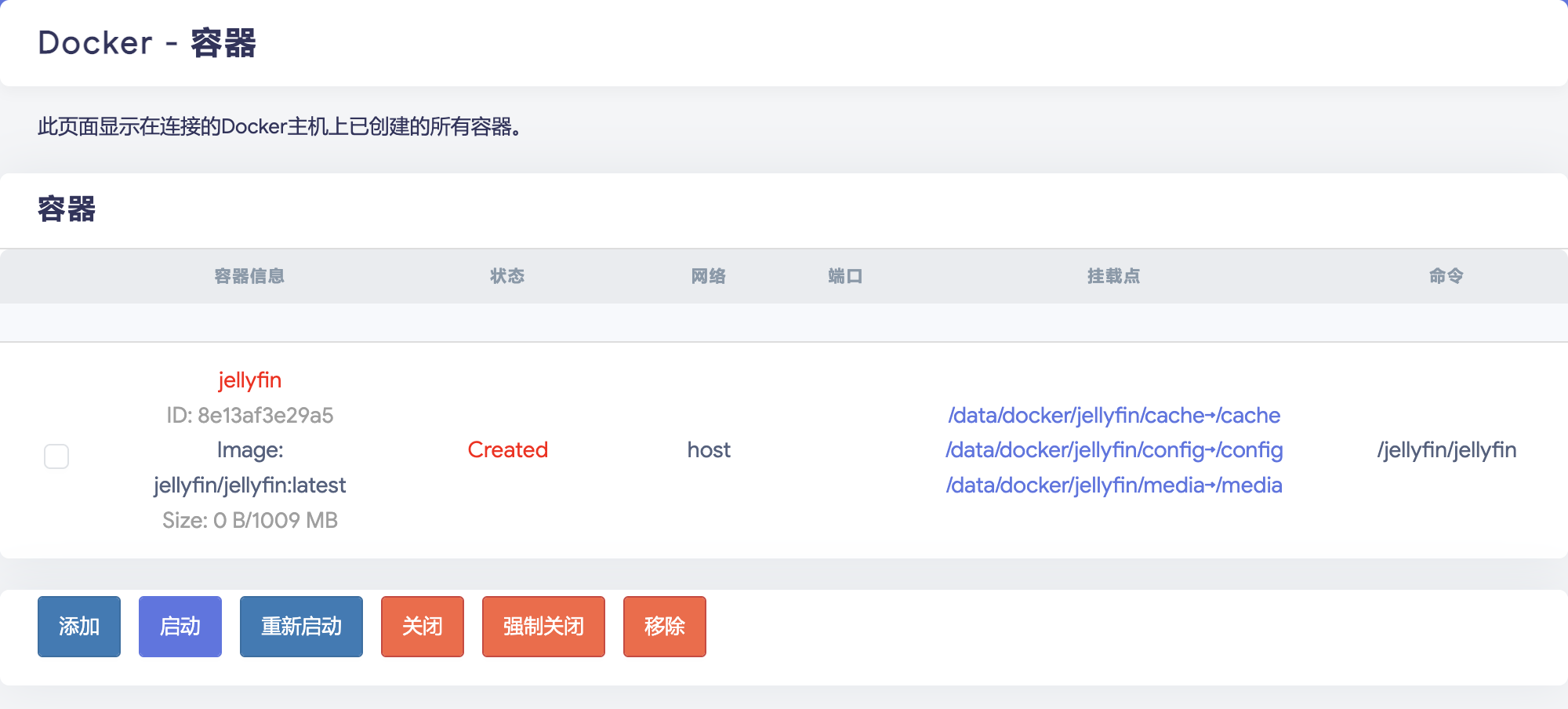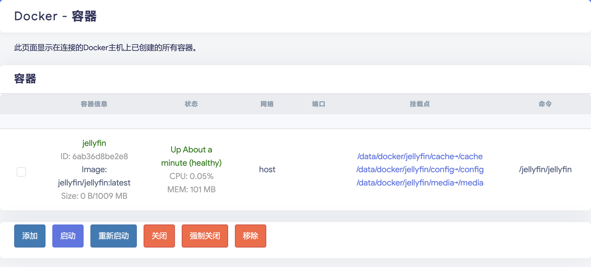 如果 总是先拉取镜像 未成功自动勾选,可以手动勾选确保运行前拉取最新镜像。单击 提交 创建容器。创建完毕后容器列表即出现 Jellyfin 容器: