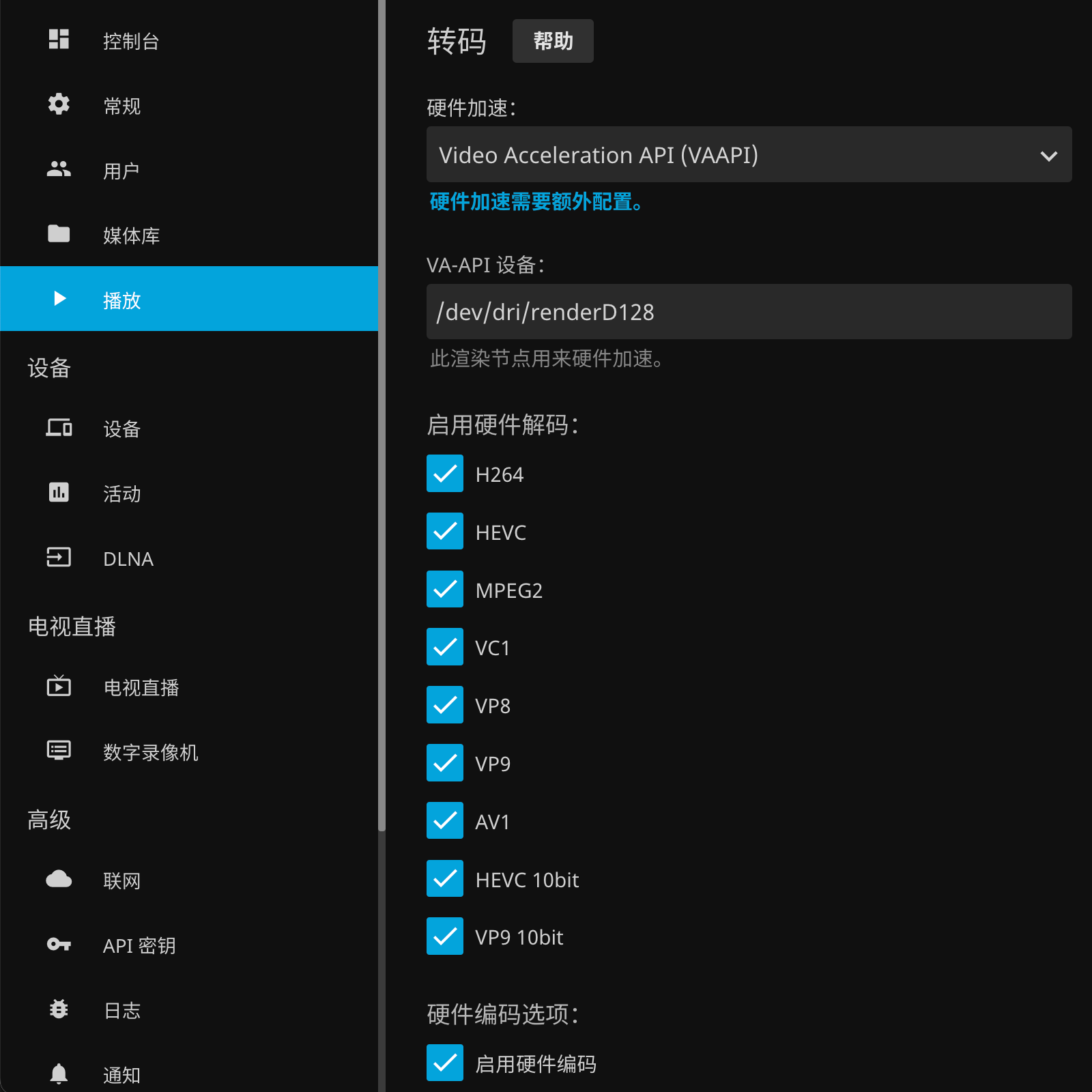 进入系统后,单击左侧菜单按钮,选择 管理 > 控制台 菜单。进入 控制台 后,选择 服务器 > 播放 菜单。将 转码 中的 硬件加速 选择为 Video Acceleration API (VAAPI),注意确认 VA-API 设备 是否为 /dev/dri/renderD128,并在 启用硬件解码 勾选所有媒体类型。注意确认 硬件编码选项 中的 启用硬件编码 选项已勾选。