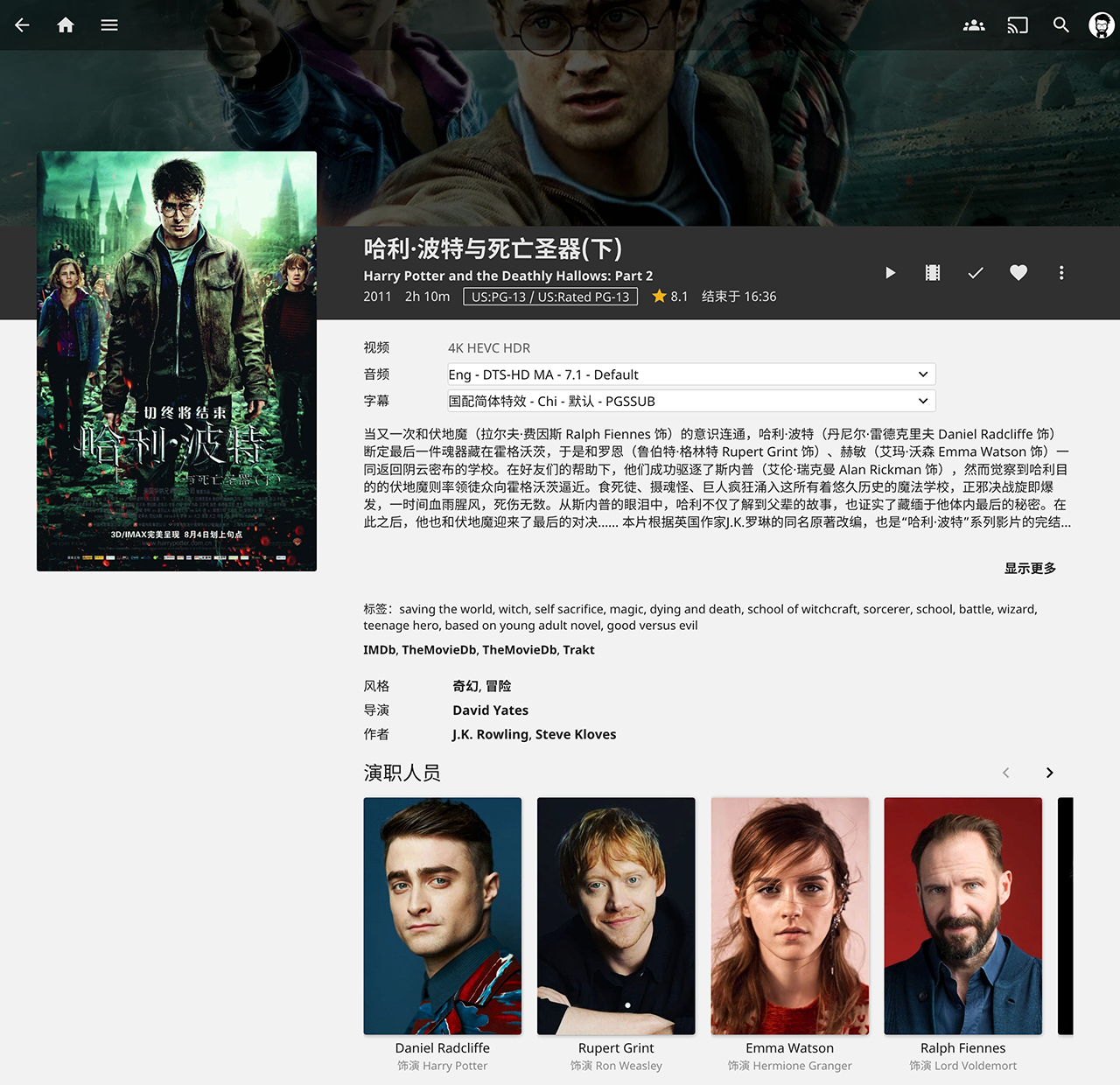 经过 TMM 刮削后,Jellyfin 即可自动识别元数据,示例电影的详细信息如下如所示: