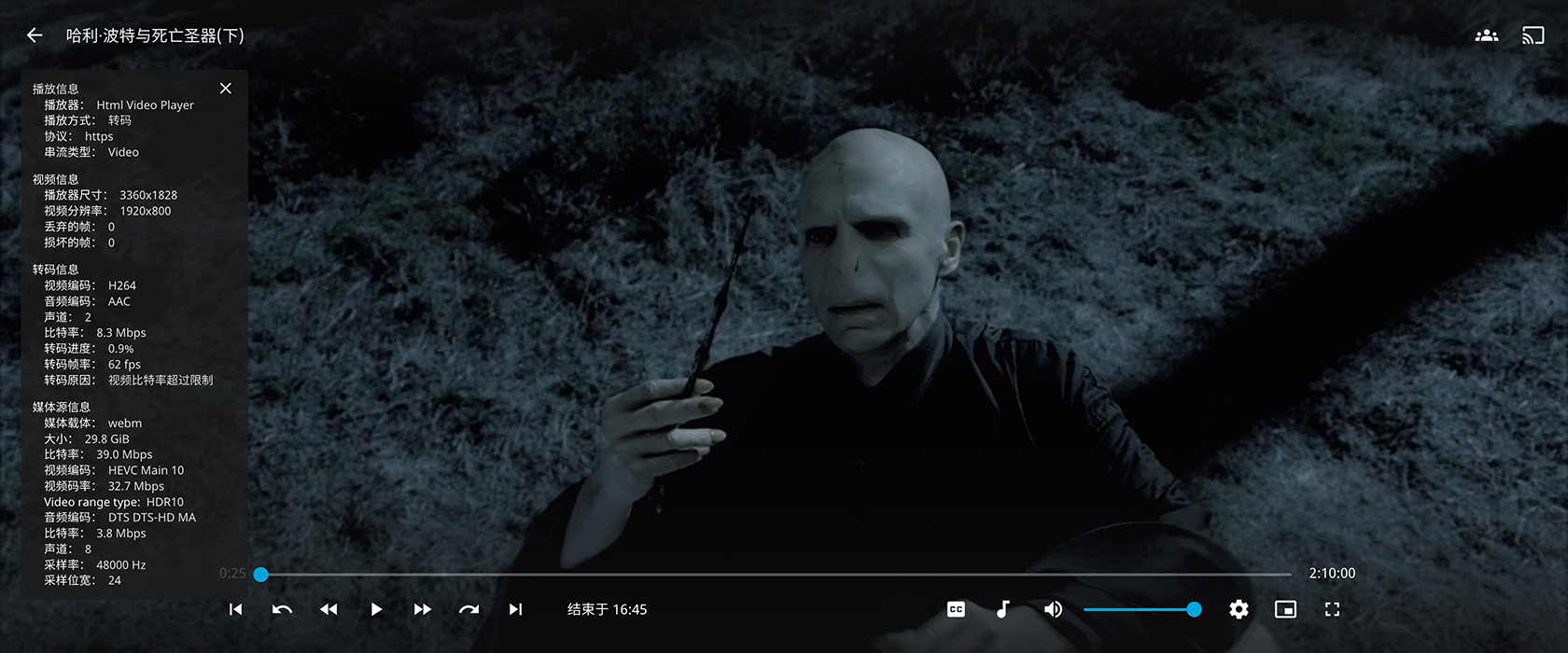 单击播放后,通过播放信息查看,已经可以使用 Jellyfin 实现转码在线播放: