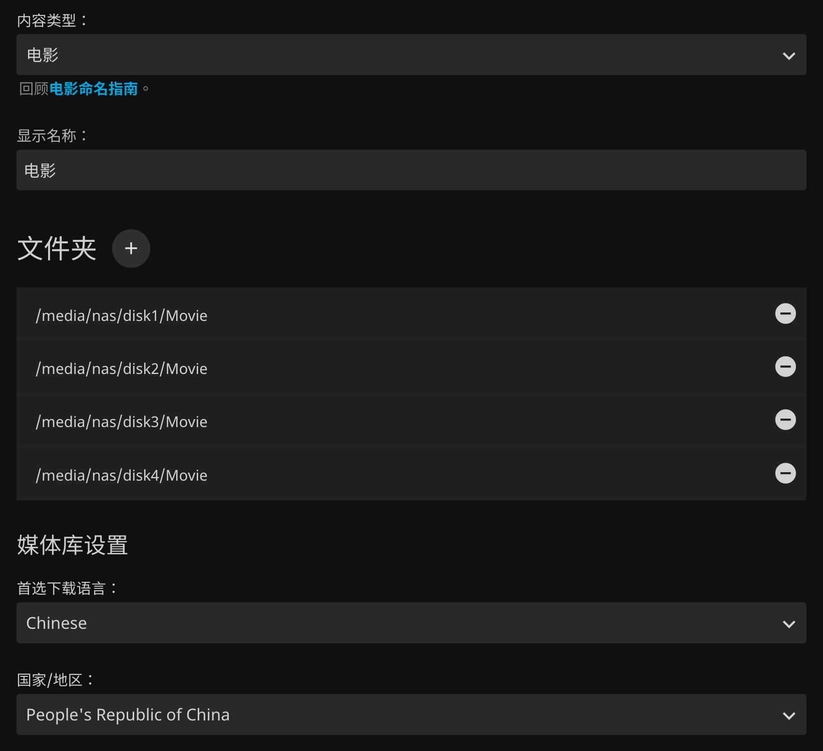文件夹中添加所有包含当前类型媒体的文件夹。 首选下载语言选择Chinese。国家/地区选择People's Republic of China。- 取消勾选