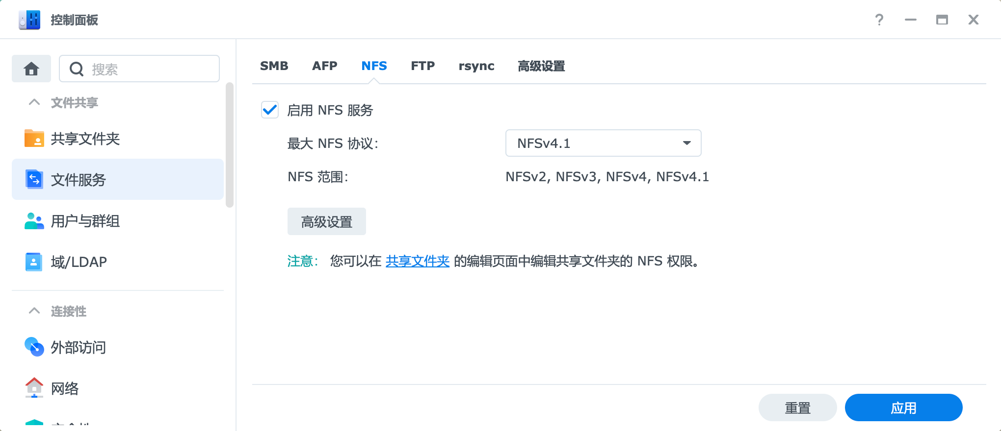 由于 Jellyfin 安装在软路由上,因此需要将 NAS 上的媒体文件夹通过 NFS 映射到软路由上,首先需要在 NAS 上配置客户端。进入 NAS,打开 控制面板,进入 文件服务,确保 启用 NFS 服务,最大 NFS 协议选择 NFSv4.1: