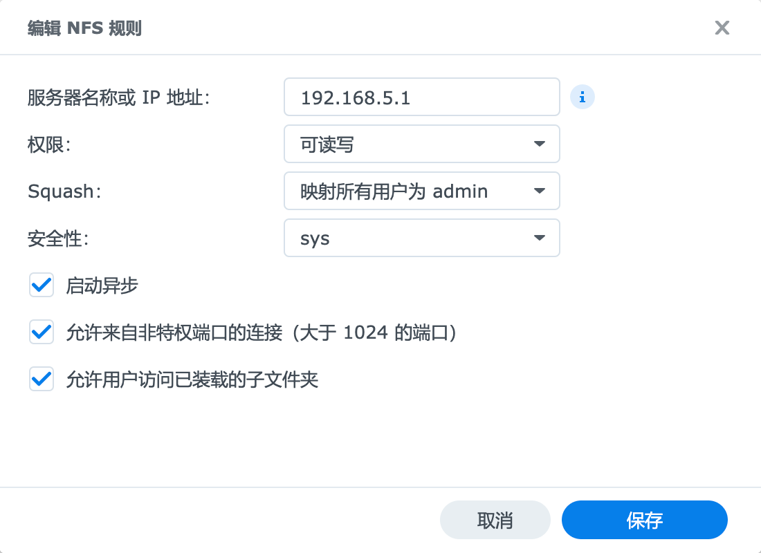 相关配置如图所示,其中 服务器名称或 IP 地址 为客户端 IP 地址(即软路由 IP 地址)。依次为所有需要共享的文件夹进行相同配置。