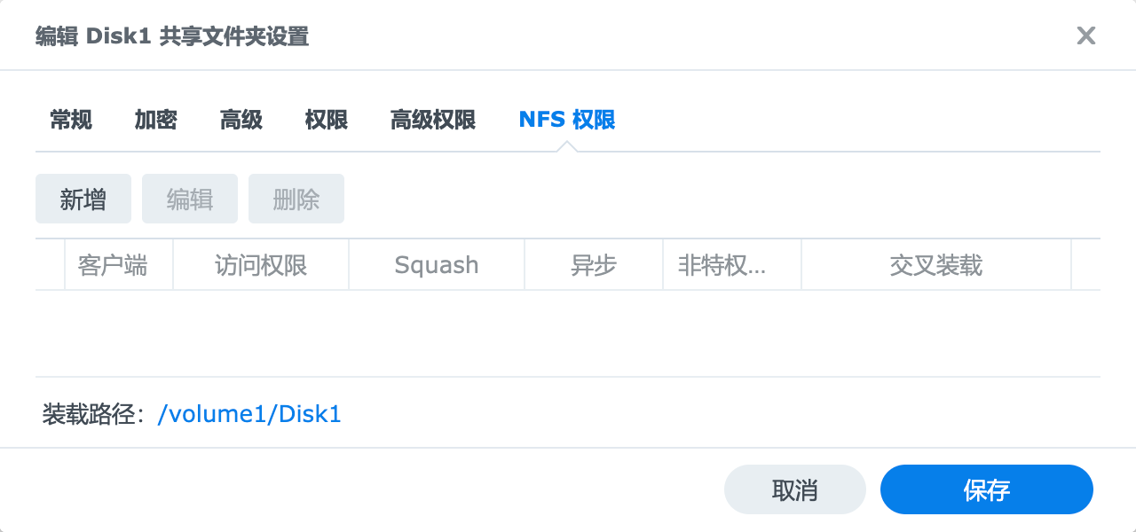 在 NFS 权限 标签页单击 新增 添加新客户端: