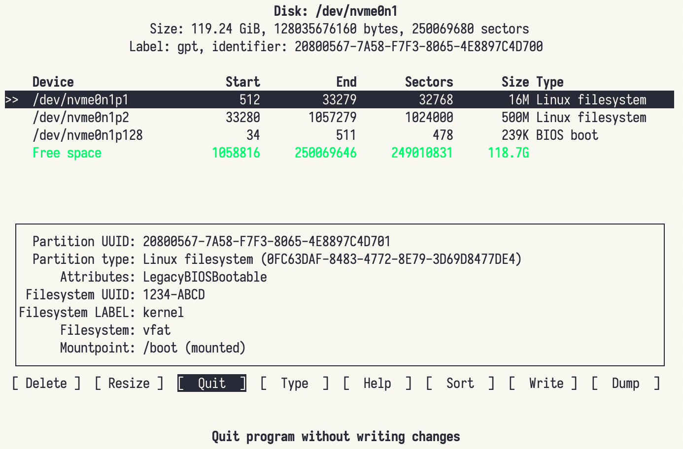 Disk /dev/nvme0n1: 119.24 GiB, 128035676160 bytes, 250069680 sectors