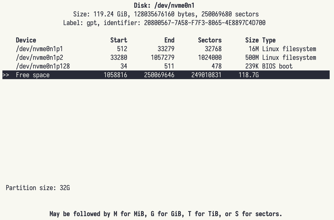 /dev/nvme0n1p1 512 33279 32768 16M Linux filesystem