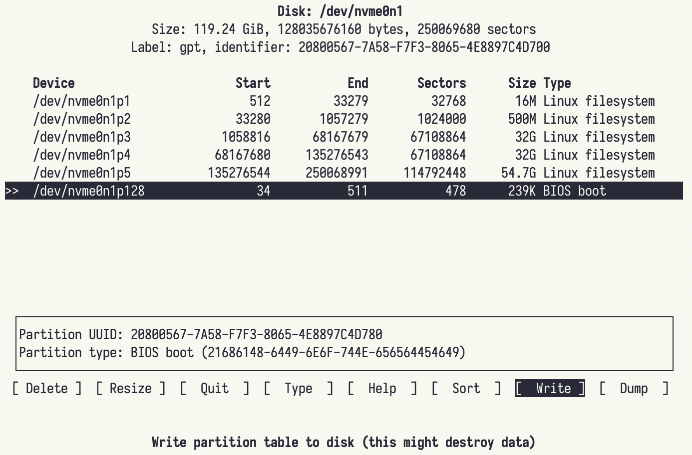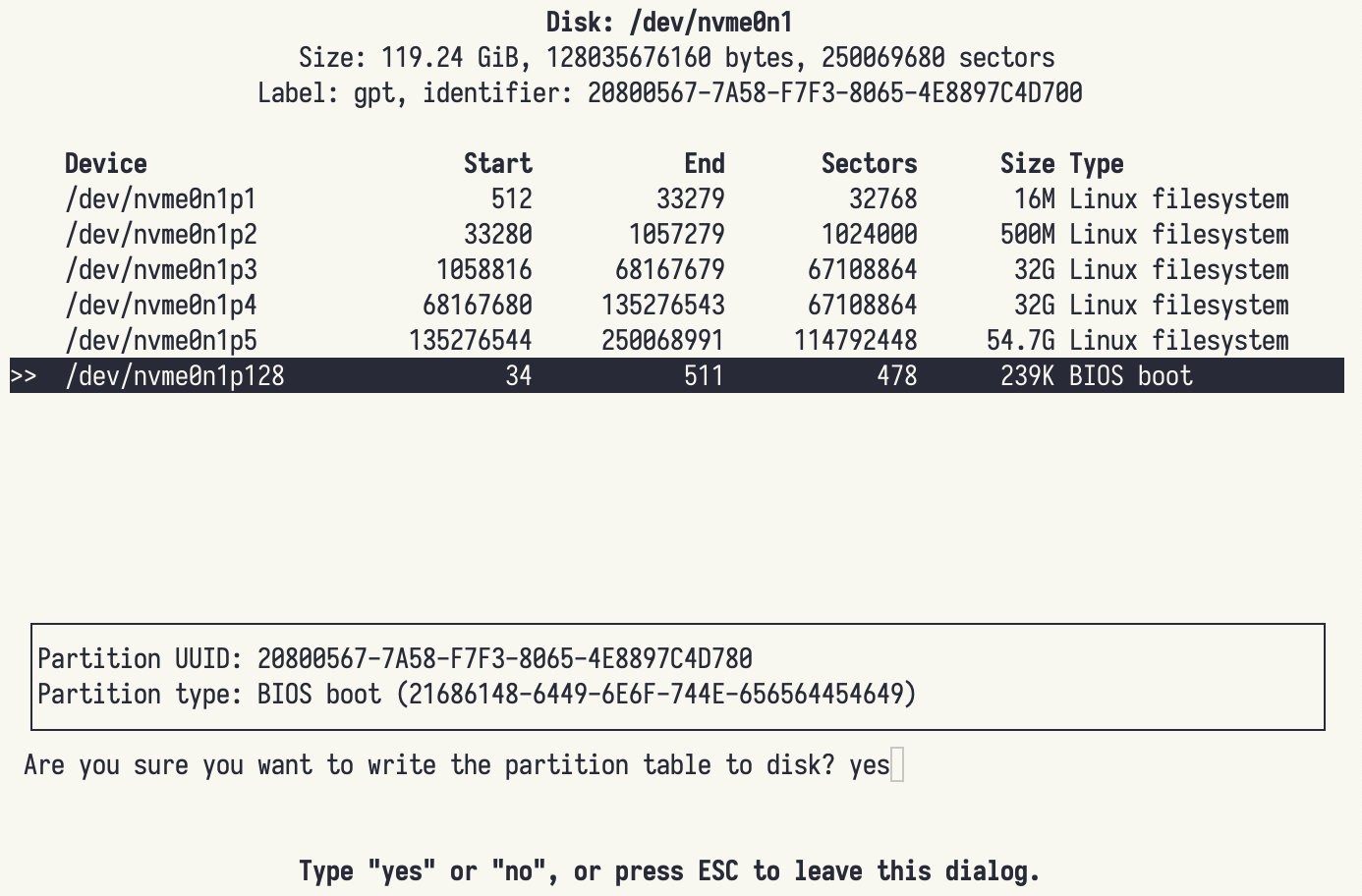 /dev/nvme0n1p128 34 511 478 239K BIOS boot
