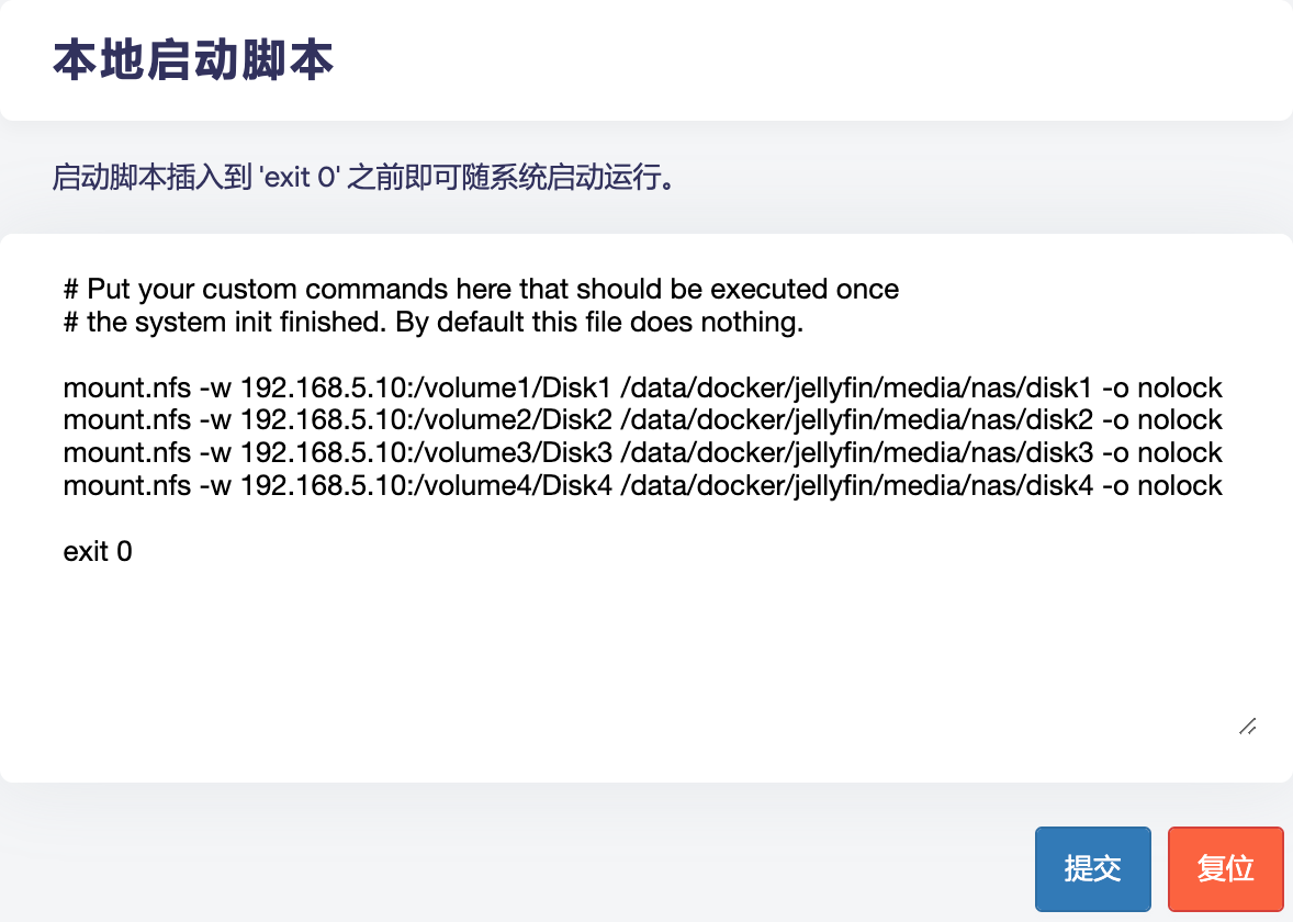为了保证每次启动软路由时能够自动挂载,请将上述内容添加至 系统 > 启动项 菜单下的 本地启动脚本 文本框的 exit 0 之前。