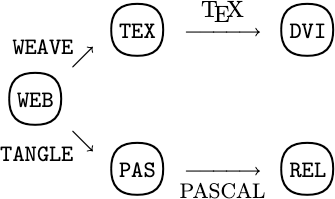 如高德纳在论文 2 中所示,相同的源文件经过“tangle”可以编译为机器代码,经过“weave”可以编译为文档。