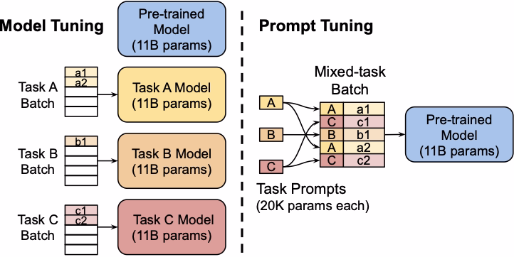 Prompt Tuning 5 可以看作是 Prefix Tuning 的简化版本,其为每个任务定义不同的 Prompt,然后拼接到数据上作为输入。